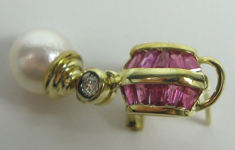 Par ørestikker af 14 kt. guld, prydet med brillantslebne diamanter, samlet ca. 0,04 ct. samt 6½ mm. perler og hver med 2 rækker baquetteslebne, rubinfarvede sten. L. ca. 27 mm., vægt 5,6 gr.