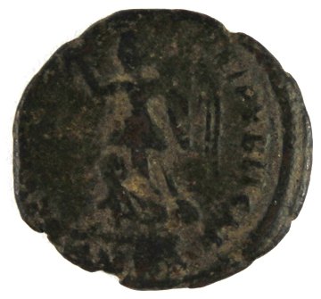 Flavius Julius Constans, søn af Constantinus Magnus. Avers med portræt, revers med kriger. Diam. ca. 17 mm.