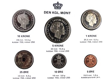 Møntsæt fra den Kgl. mønt 1987 med 5, 10 og 25 ører samt 1, 5 og 10 kr. Ucirkuleret.