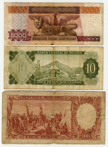 7 sedler fra Argentina og Bolivia,