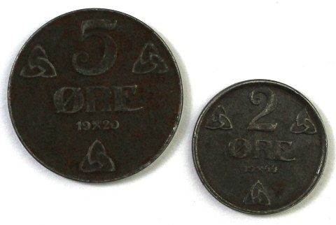 Håkon VII 5 øre 1920 og 2 øre okkupationsmønt