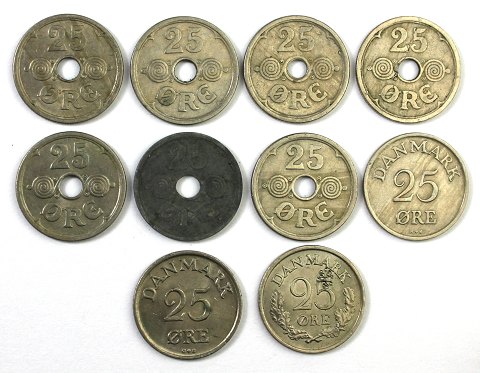 Chr. X 25 øre 1925 - H 24A, 1935, -37, -38, -39, -41, - 47 -H 24B samt Frederik IX 25 øre 1948 - H 8A, 1959 H 8B og 1960 - H 9.
