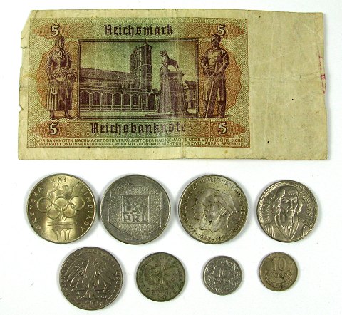 Lot bestående af 5 Reichmark seddel 1942 J1, 200 slotych 1974 - Y#72, 1975 - Y# 79 og 1976 - Y#86, 10 zlotych 1967, henholdsvis Y#51 og Y#58, 2 slote - Y#20, 10 groscy 1923 og 1949 Y#11 og Y#42. 9 enheder i alt.