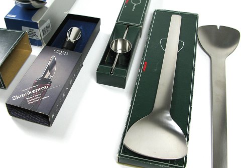 Lot beståenmde af Stelton Erik Magnussen design salatbestik nr. 532, tandstikholder nr. 487, 2 cl. målebæger nr. 519 samt Rosendahl skænkeprop, Erik Bagge design og Gense Twist" sauceske. Alle dele ubrugt i originalæsker.