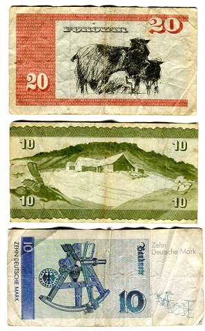 Lot bestående af Færøerne 20 kr 1986 A0 - Sieg 28, 10 kr 1978 A0 - Sieg 27 samt Tyskland 10 Mark 1993 DU. 3 sedler i alt.