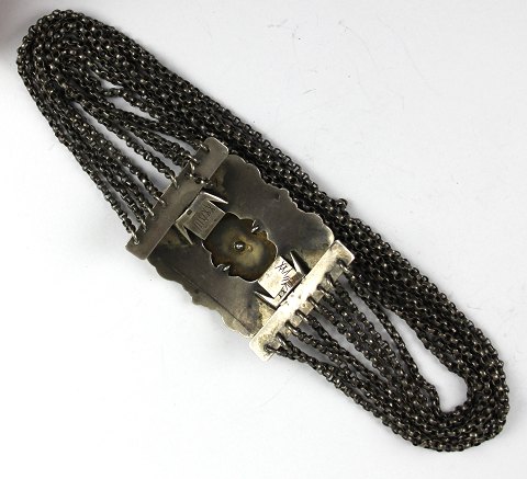 Tætsluttende halssmykke af delvist forgyldt sølv, dekoreret med volutter og prydet med emaille med isatte, små perler og formodentlig enkelt rubin. Par ørelokker, hvoraf den ene er omforandret til broche medfølger. Steplet AV. L. ca. 31,5 cm., samlet vægt ca. 51 gr.