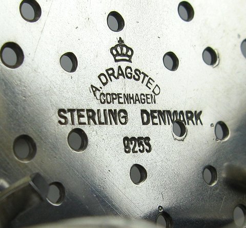 A. Dragsted is spand af vaseformet glas med muslingeformede hanke (Form. Kastrup Glasværk) samt sigte indsats af sterling sølv. H. 16,5 cm, Diam. 12 cm.