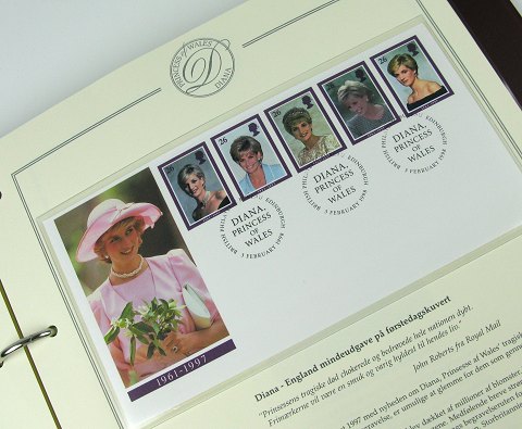 Ringbind i kassette med frankerede og annullerede førstedagskuverter og jubilæumsudgivelser samt møntbreve med henholdsvis 5 Pound 1997, 5 Pound 1997 i erindrings-møntsæt, 5 Crowns Turks & Caicos Islands samt enkelt erindringsmedaille af bronze. I alt 84 enheder.