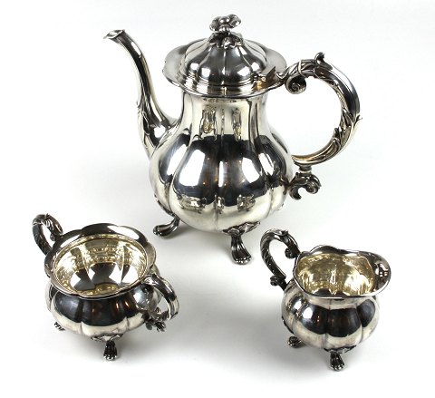 Kaffestel i barokform bestående af kaffekande samt sukker og flødesæt. Skævknækket korpus på fire ben, dekoreret med bladværk og volutter. Lågknop afsluttet med blomst. Kande H. 23 cm. Samlet vægt 1121 gr.