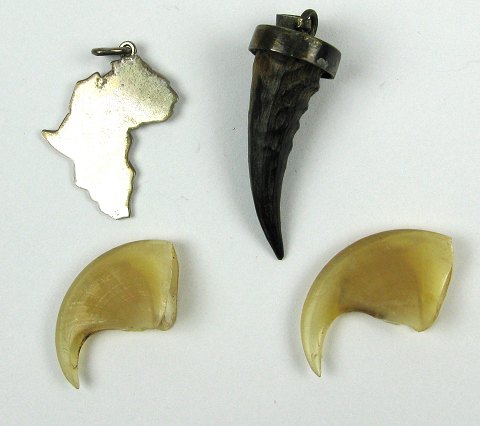 Lot bestående af sølvindfattet vedhæng med horn fra næsehornbille, to løvekløer samt sølvvedhæng udformet som den afrikanske kontinent. sidstnævnte L. 28 mm.