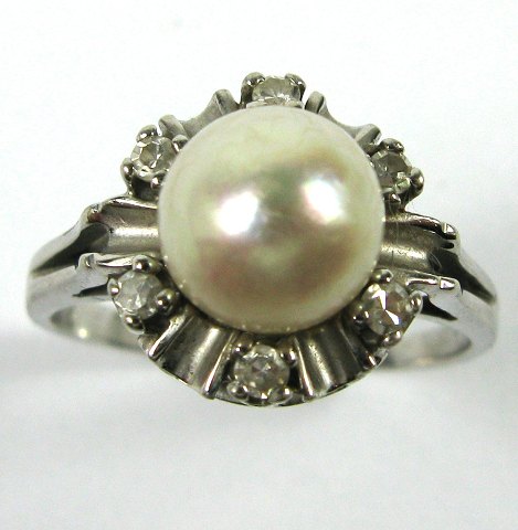 Rosetring af 14 kt. hvidguld, prydet med 7 mm. kulturperle, omkranset af 6 diamanter, samlet ca. 0,10 ct. Ring Str. 51, vægt 3,5 gr.