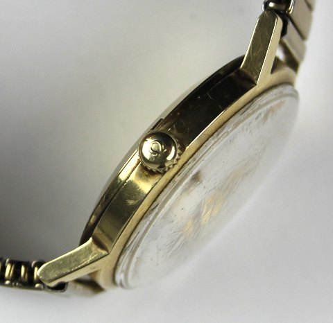 Omega herrearmbåndsur i urkasse af 14 kt. guld. Sølvfarvet skive med stregindikationer, central sekundviser og datovisning i #3 positionen. Automatisk værk kaliber 565. Urkasse Diam. 35 mm. Ref. nr. 166 070. Vægt ca. 65 gr. Fixoflex lænke.