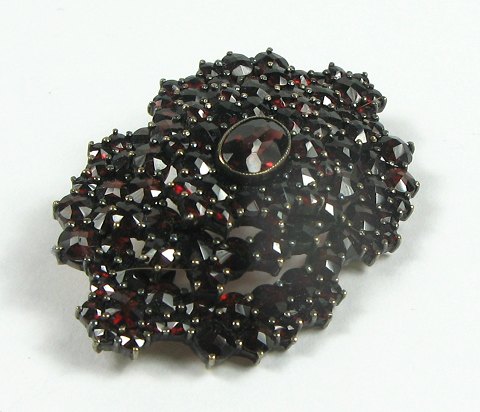 Oval broche af forgyldt sølv prydet med granater. 44x30 mm. Vægt ca. 11 gr
