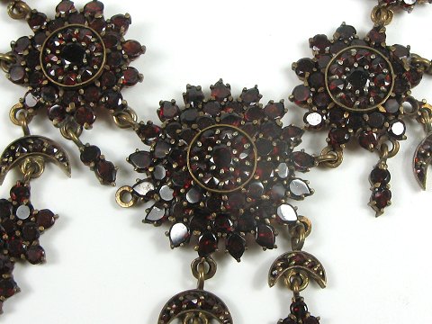 Halssmykke med stjerneformede vedhæng i varierende størrelse af forgyldt sølv prydet med mange små granater. Et vedhæng mangler.