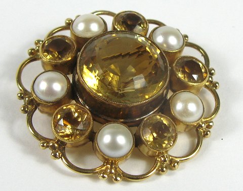 Håndlavet rosetformet broche af 18 kt. guld prydet med 5 perler (diameter 6,5 mm), en stor citrin (diameter 16 mm) og 5 små citriner (diameter 6,5 mm).