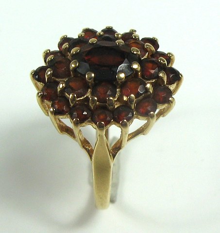 Ring af 14 kt. guld prydet med talrige små granater og en stor granat.