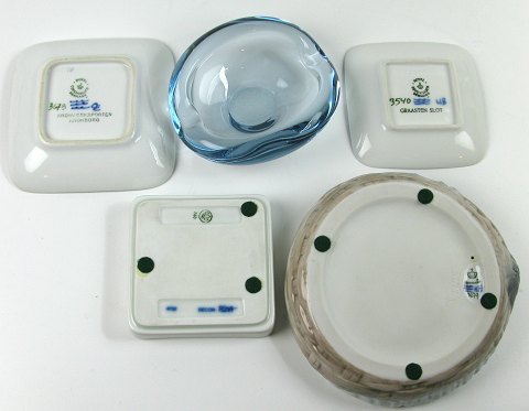 Lot bestående af Kgl. askebægre dess. nr. 3277, 3673 og 3540, Holmegaard askebæger af glas samt B&G skål 4732 med Runa decor.