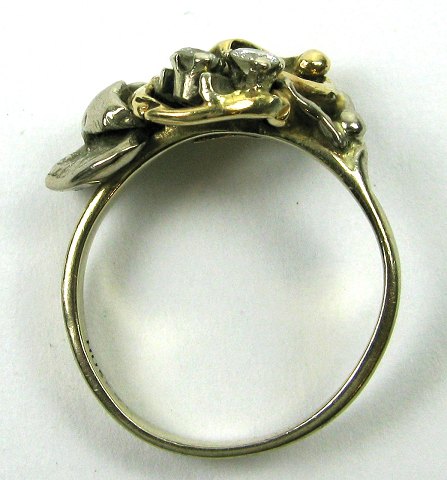 Design ring af 14 kt. guld, prydet med 2 brillantslebne diamanter, samlet ca. 0,12 ct. samt 3 mm. kulturperle. Ring str. 52, vægt 5,6 gr.