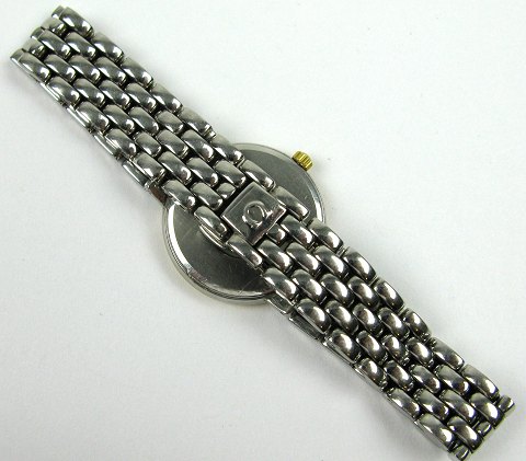 Omega damearmbåndsur model De Ville i urkasse af delvist forgyldt stål. Champagnefarvet skive med stregindikation. Quartsværk. Urkasse 23 mm. i diameter.