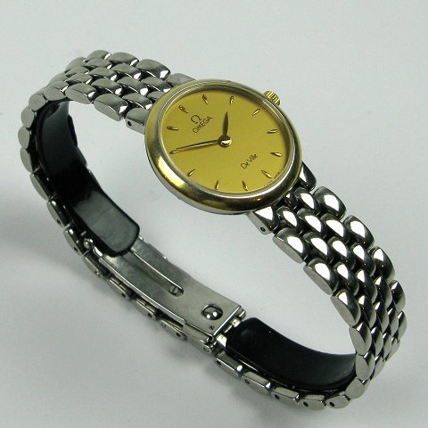 Omega damearmbåndsur model De Ville i urkasse af delvist forgyldt stål. Champagnefarvet skive med stregindikation. Quartsværk. Urkasse 23 mm. i diameter.