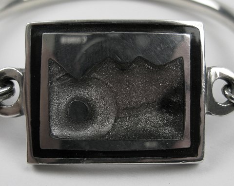 Armring af sølv med rektangulær, hængslet front, prydet med emailledekoration. Utydelig stemplet, diameter indvendig ca. 60 mm., ca. vægt ca. 45 gr.
