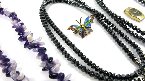 Lot betående af ametysthalskæde, 2 hematit halskæder, halskade af benperler, dameur, sommerfuglebroche, sølvindfattet ben klo og kvartsvedhæng.