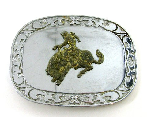 Original amerikansk rodeo bæltespænde af forkromet metal, prydet med rodeo cowboy til hest af messing, 9,5 x 7 cm., US ranch bæltespænde af forkromet metal, prydet med hestehoved i hestesko af delvist bemalet messing samt jubilæumsbæltespænde fra Crystal Creamery i Sacramento, Cal. 1901-1976. Proveniens: tilhørt Dansker, bosat i Sacramento, Cal.
