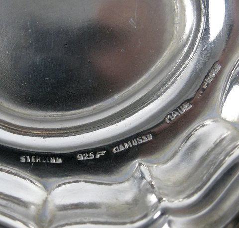 Lille oval opsats med ligeknækket korpus med buet, svejfet kant og fodstykke af sterling sølv. H. 7 cm., 17,5 x 15,5 cm. Fremstillet i Peru hos Camusso.
