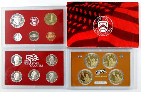 Alle sølv på nær dollar, cent, nickel og *Presidential dollar proof* sættet. Originalæske, displaykassetter og certifikat med nøje beskrivelse af hver mønt medfølger.