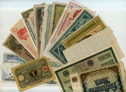 Lot sedler far hele verden, heriblandt en del sedler fra inflationstiden omkring 1920. 33 sedler i alt.