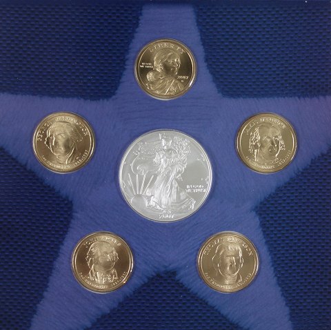 Møntsæt indeholdende USA, Liberty dollar one ounce finsølv 2007W Proof - *American Eagle* samt 5 stk. Presidential dollar.