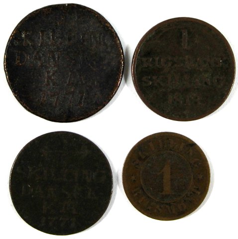 Chr. VII skilling og ½ skilling 1771 samt Fr. VII skilling rigsmønt 1856 og rigsbankskilling 1818. 4 mønter i alt.