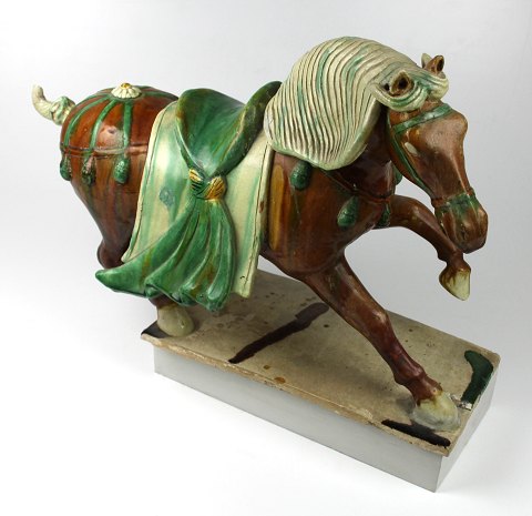 Tang hest af håndbemalet, hult lertøj på rektangulær fodstykke. L. 49 cm., H. 34 cm.