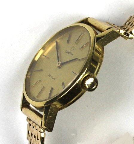 Omega De Ville damearmbåndsdur i urkasse og med lænke af 14 kt. guld. Champagnefarvet skive med stregindikationer. manuelt mekanisk optræksværk. Urkasse diameter 24 mm. Murstenslænke af 14 kt. guld. Samlet vægt 32,5 gr.