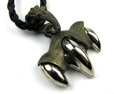 Halssmykke af flettet læder med vedhæng og karabinlukke af delvist forsølvet metal.