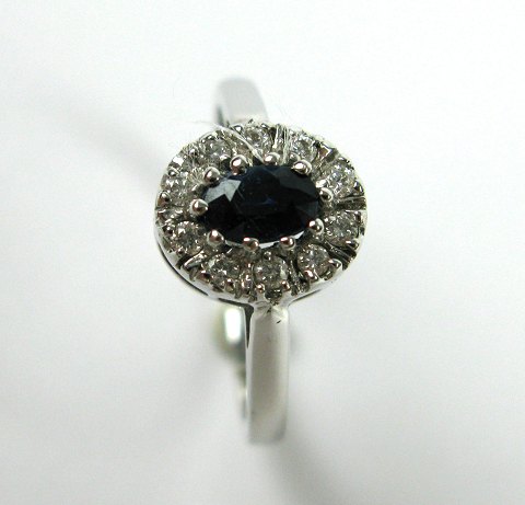 Ring af 14 kt. hvidguld prydet med facetsleben safir 0,66 ct og omkranset af 11 små brillanter ialt 0,19 ct. Top Wesselton VVS Ring str. 54,5, vægt ca 4 gr.