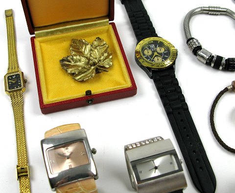 Lot bestående af flora Danica broche af sterling sølv, 4 damearmbåndsure, herrearmbåndsur samt armringe.