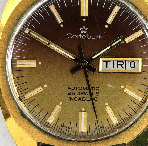 Cortebert Automatic herrearmbåndsur i urkasse af forgyldt metal med brun/champagnefarvet tonet skive med stregindikation, central sekundviser og dag/datovisning i #3 positionen. automatisk værk med 25 juveler, Incabloc.