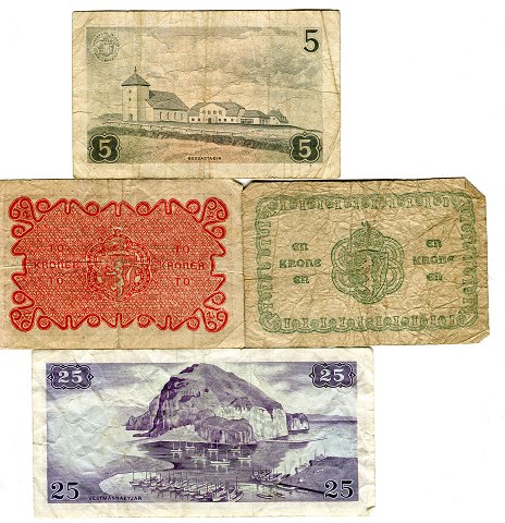 Lot bestående af Island 25 kr (1965C1) - Sieg 49, Pick 43, 5 kr (1960A2) - Sieg 43, Pick 37 samt Norge kr 1917 og 1918. 4 sedler i alt.