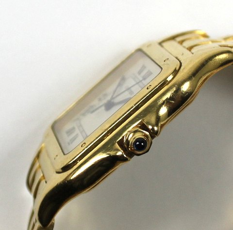 Cartier Panthere armbåndsur i urkasse og med lænke af 18 kt. guld. Hvid skive bag safirglas med romertal og central sekundviser. Quartsværk. Urkasse 27x27 mm.