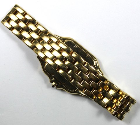 Cartier Panthere armbåndsur i urkasse og med lænke af 18 kt. guld. Hvid skive bag safirglas med romertal og central sekundviser. Quartsværk. Urkasse 27x27 mm.