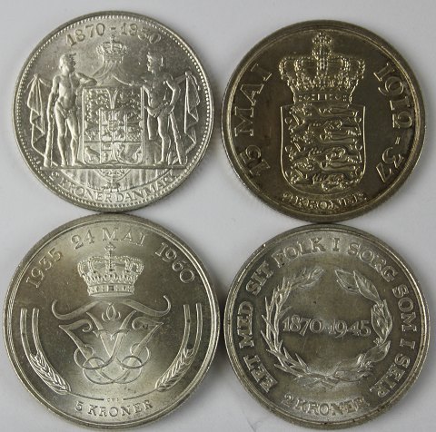 Lot bestående af 2 kr. Chr. X 1930, -37 og 45 samt Fr. IX 2 kr. 1960. Henholdsvis H 5, H6, H7 og H1. Samlet finsølvindhold 48 gr.