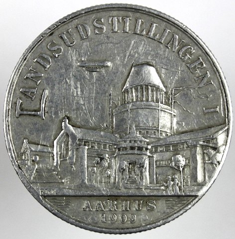 Landsudstillingen Aarhus 1909, erindringsmedaille af aluminium med motiv fra udstillingen og evighedskalender på bagsiden. Diam. 38 mm.