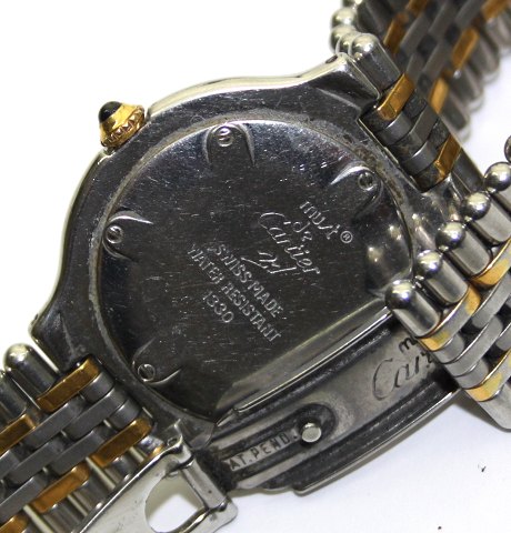 Cartier model "Must de Cartier 21", Ref. nr. 1330 med sølvfarvet skive med streg- og talindikationer, stor krans med romertal. Safirglas. Quartsværk. Urkasse diameter 31 mm.