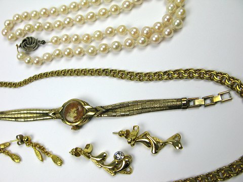Smykke lot bestående af 2 perlekæder, halssmykke, 2 par årestikkere samt smykke ur af guld doublé.