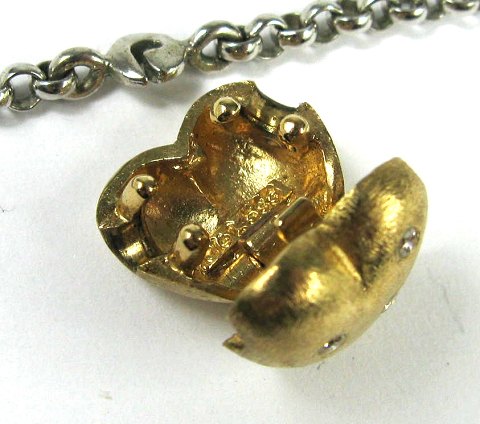Ole Lynggaard halssmykke af 14 kt. guld, bestående af OL halskæde af sterling sølv med hjerteformet vedhæng af 14 kt. guld, prydet med 3 brillantslebne diamanter, samlet ca. 0,05 ct. Kæde L. 40 cm. Vedhængets vægt: 2,9 gr.