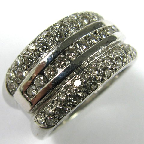 Ring af formodentlig 14 kt. hvidguld med tredelt skinne, prydet med 44 brillantslebne diamanter, samlet ca. 0,60 ct. Ring Str. 52, vægt 10,8 gr.