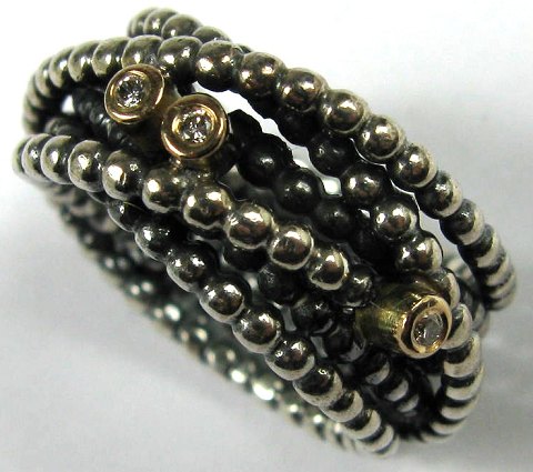 Ring af sterling sølv med skinne i form af perlerækker, prydet med 3 guldindfattede, brillantslebne diamanter, samlet ca. 0,05 ct. Ring Str. 50