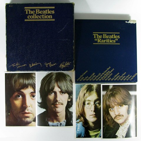 Samling Beatles 33 1/3 LP'er i midnatsblå boks, indeholdende 4 større farvefotos med portræt af John, Paul, George og Ringo samt 7 albums og 2 dobbeltalbums: The Beatles Rarities - Yellow Submarine - Please Please Me - Let It Be - Help! - Rubber Soul - Revolver - With The Beatles -A Hard Days Night - Beatles for Sale - Back in the U.S.S.R (dobbelt LP) og St. Peppers Lonely Hearts Club Band. The Beatles - 1962 - 1970. Listen to the music her