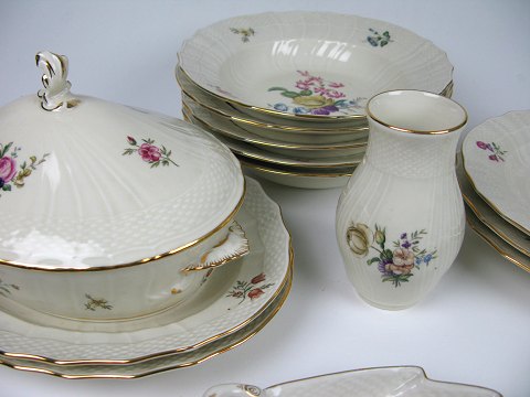 Kgl. Frijsenborg porcelæn bestående af lågfad, ca. 27 x 20 cm., 2 ovale fade 31 x 24 cm., 5 dybe middagstallerkener og 3 flade middagstallerkener, Diam. 25 cm., tresidet fad, 2 asietter L. ca. 22,5 og 18,5 cm. samt vase, H. 14,5 cm. 15 dele i alt. Bortset fra et ovalt fad (2.sort). er alle andre dele 1. sortering.